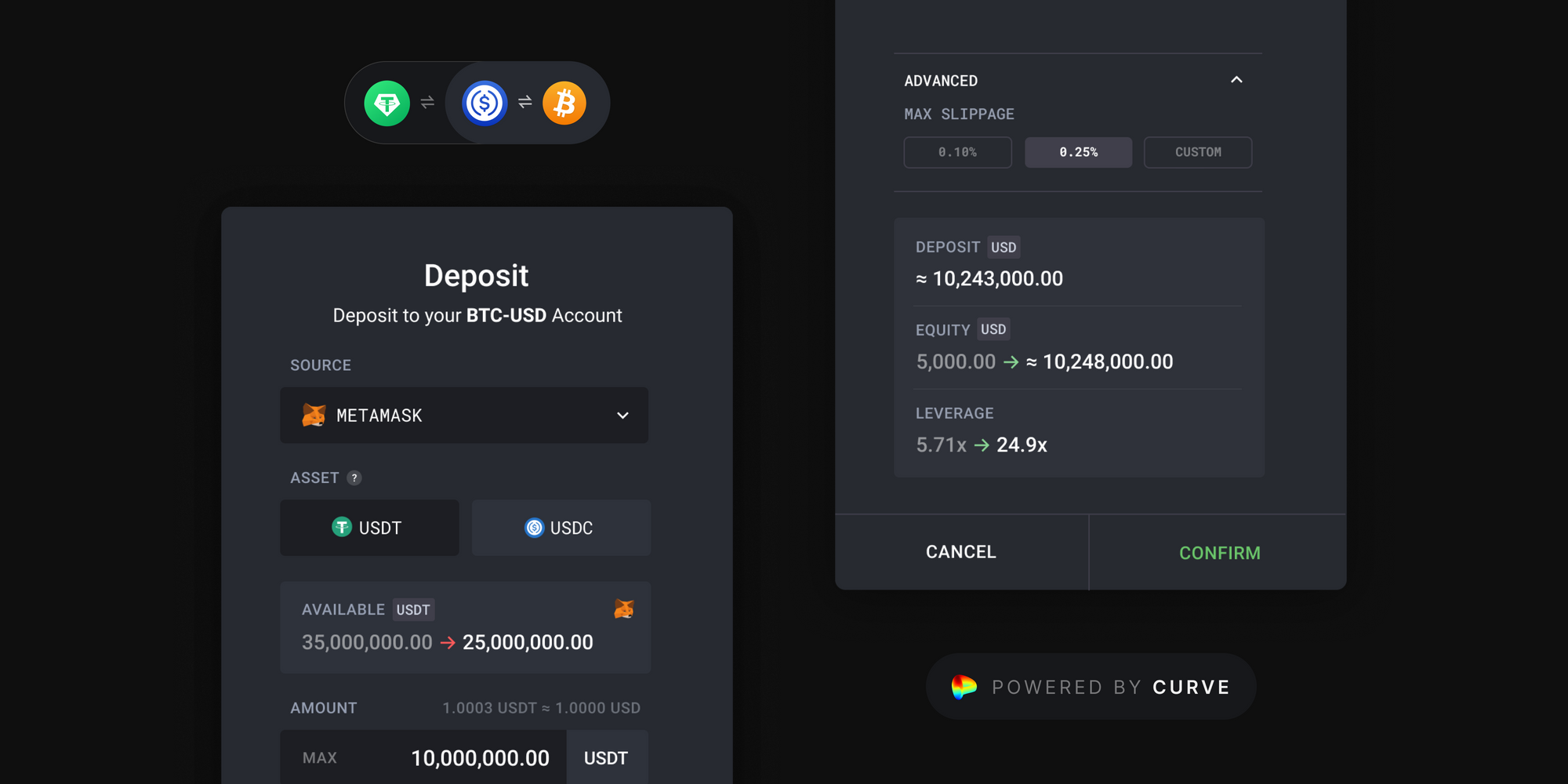 dYdX makes it easy to deposit USDT to the BTC-USD Perpetual. Behind the scenes, dYdX integrates with Curve to convert the USDT to USDC that is ultimately held as collateral. Curve is an open decentralized exchange, and has one of the most liquid USDC-USDT markets, ensuring minimal slippage during this conversion.