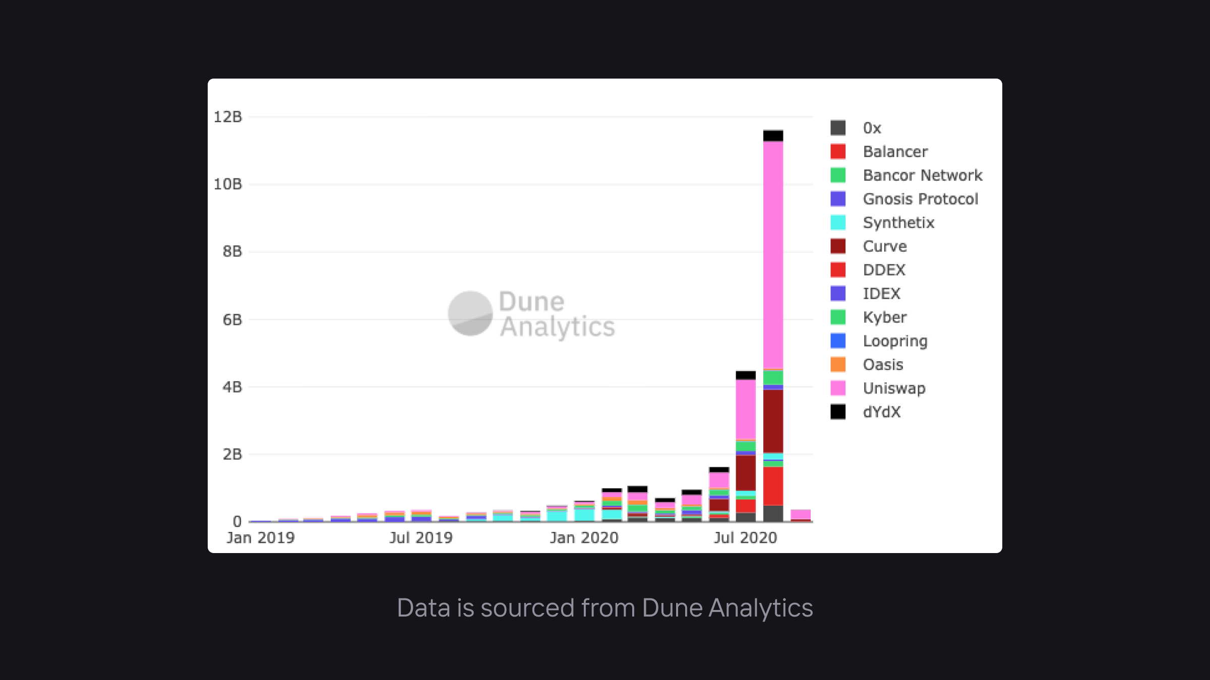 Stablecoins really started to see growth when new primitives came to market. The ability to exchange stablecoins for crypto through decentralized exchanges such as dYdX, 0x, and Kyber or the ability to borrow and lend stablecoins through platforms like dYdX and Compound, made stablecoins that much more powerful. Users could remain on-chain for a lot of their banking needs.
