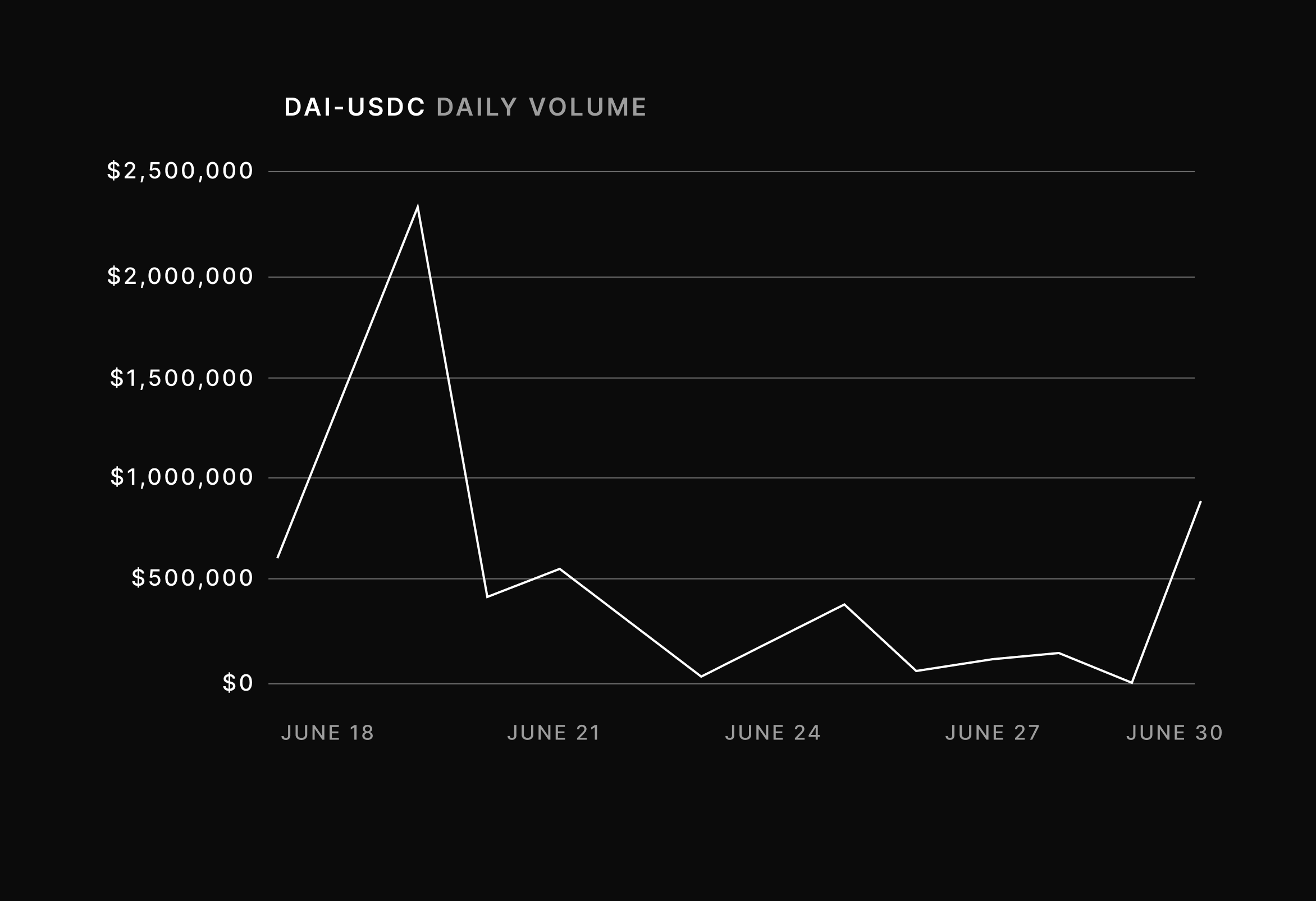 Over the last two weeks, we saw the most flow in ETH<>USDC, with DAI<>USDC being a close second. Liquidity has improved on our ETH<>USDC so that most likely became our preferred venue to get ETH exposure. Based on everything happening with yield farming, we attribute the increase in DAI<>USDC volume to users swapping stablecoins so they can capture various yield opportunities.